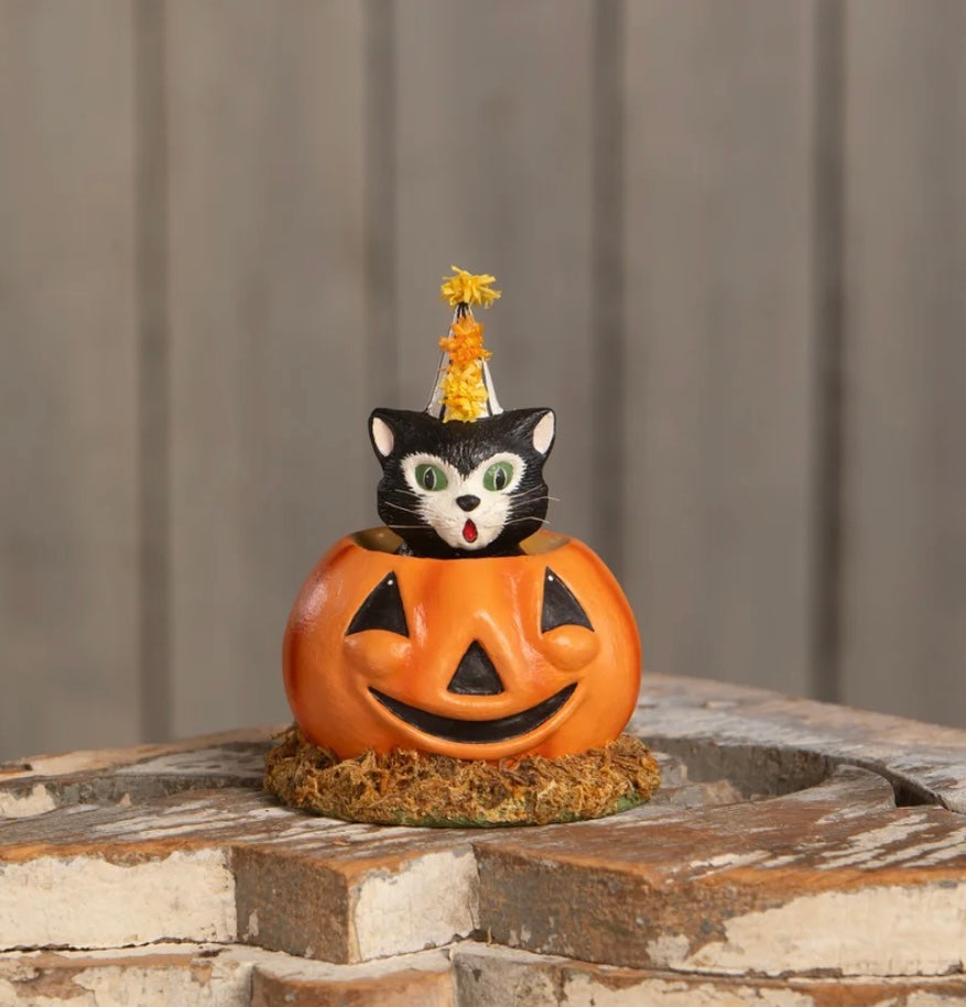 Cecil is hanging out waiting for the party in this pumpkin. This cat wears a black and white stripped hat adorned with yellow and orange crepe paper poms. Make him a part of your Halloween traditions!