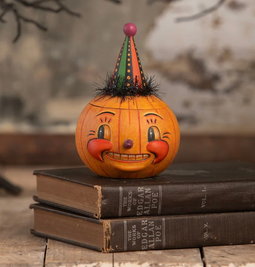 Cecil is hanging out waiting for the party in this pumpkin. This cat wears a black and white stripped hat adorned with yellow and orange crepe paper poms. Make him a part of your Halloween traditions!
